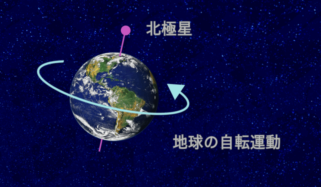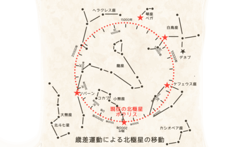 この歳差運動によって、自転軸の先端、つまり「北極星の位置が移動していきます」