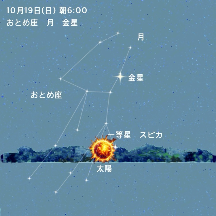 特に 10/19(日) の夜明け、 細い月と金星の並び は、やわらかな「新しい一歩」のはじまりを告げる象徴的な空模様です🌙✨